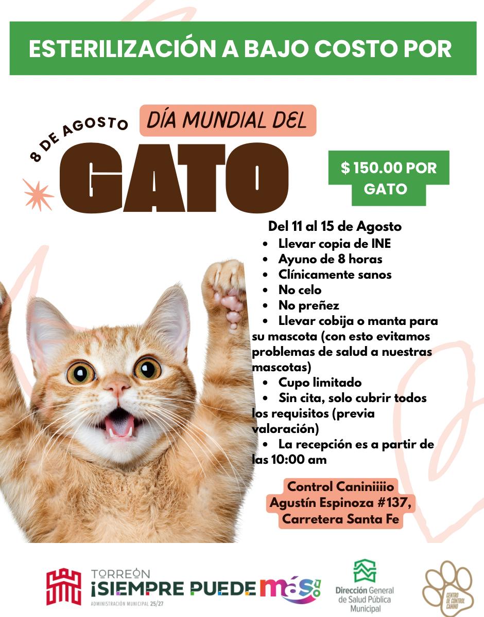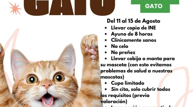 El costo del procedimiento es de 150 pesos por gatito, y se realizará en las instalaciones de la dependencia ubicadas en Agustín Espinoza número 137, en Carretera Santa Fe.