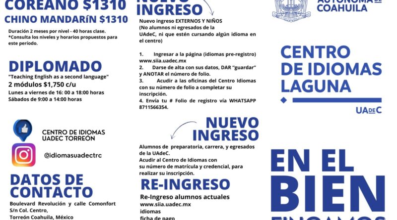 TORREÓN, Coahuila. 12 de agosto de 2025. El Centro de Idiomas de la Universidad Autónoma de Coahuila, Unidad Laguna, abre su periodo de inscripciones para los cursos de inglés, francés, italiano, japonés, alemán, coreano, chino mandarín y español para extranjeros, dirigidos al público en general, estudiantes y trabajadores universitarios.