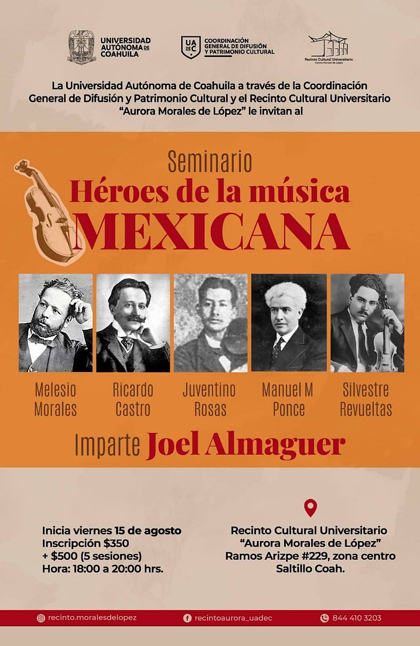 SALTILLO, Coahuila. 14 de agosto de 2025. Este viernes 15 de agosto inicia el Seminario “Héroes de la Música Mexicana” al cual la Universidad Autónoma de Coahuila, a través del Recinto Cultural “Aurora Morales de López” invita a inscribirse para conocer sobre figuras relevantes de la música de nuestro país.