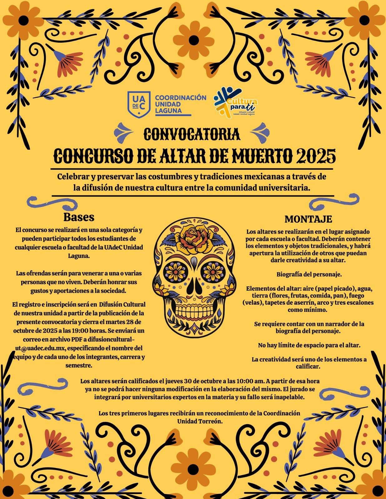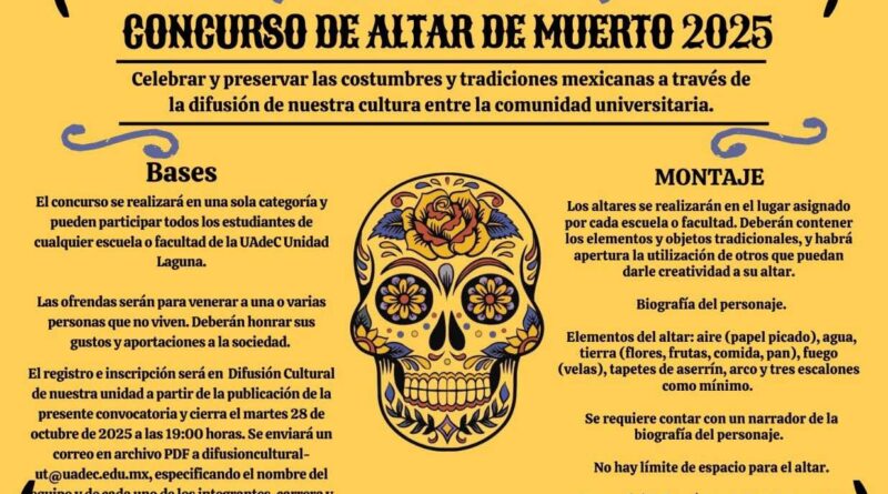 En la Unidad Laguna, la Coordinación de Unidad convoca al Concurso de Altar de Muertos 2025, dirigido a estudiantes de todas las escuelas y facultades, esta iniciativa busca celebrar y preservar las tradiciones mexicanas a través de la elaboración de altares dedicados a personajes significativos.