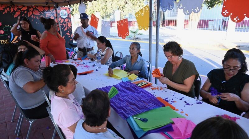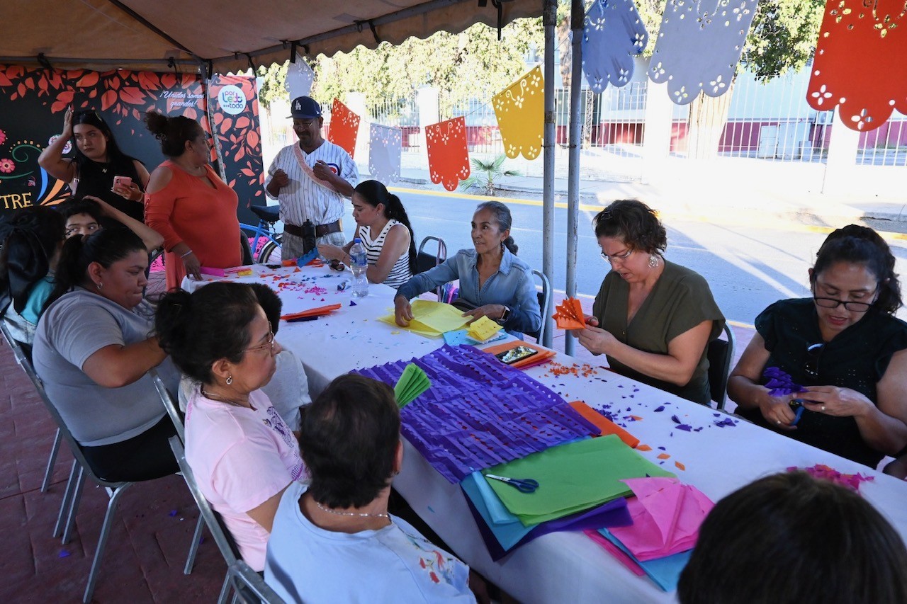 El radiante atardecer combinaba con el cálido ánimo de los participantes quienes con papel china y unas tijeras realizaban bellas creaciones para colocar en sus altares de muertos: flores, estrellas, corazones y círculos fueron algunas de las figuras que aprendieron a hacer en este taller.