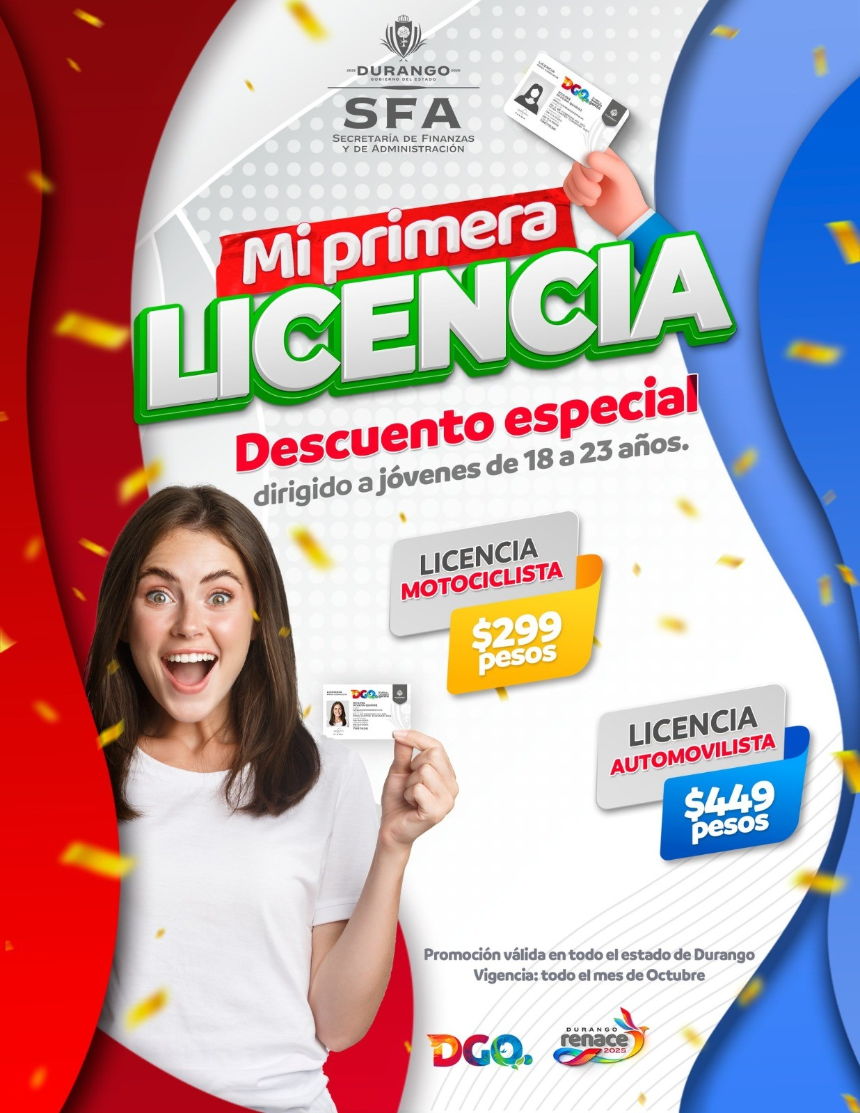 Comarca Lagunera,. En apoyo a la economía de las familias duranguenses, el gobierno de Esteban Villegas Villarreal sostiene en el mes de octubre los precios preferenciales para el Programa “Mi Primera Licencia”, dirigido a jóvenes de 18 a 23 años, así como en la renovación del documento.