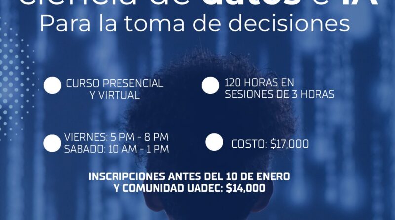 Inscríbete y conviértete en un agente de innovación capaz de aplicar la ciencia de datos y la inteligencia artificial en cualquier campo, el costo es de $17,000.00 pesos para externos y de $14,000.00 para la comunidad de la UAdeC, el registro estará abierto hasta el 10 de enero de 2026 en https://acortar.link/1|NAGK.