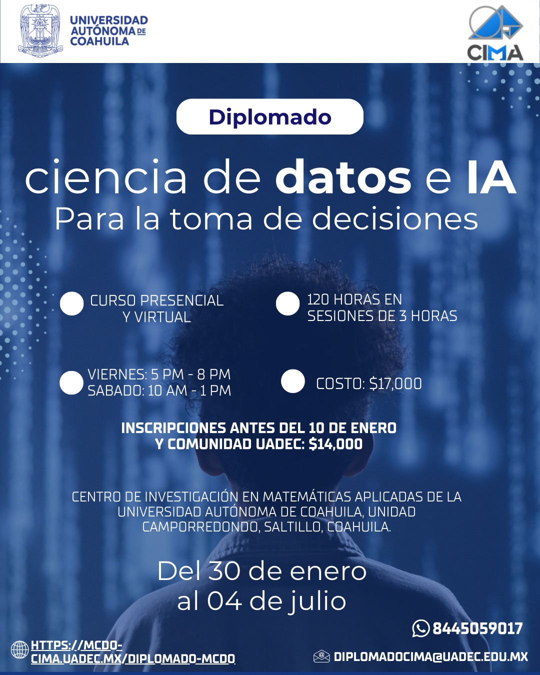 SALTILLO, Coahuila. 30 de octubre de 2025. La Universidad Autónoma de Coahuila a través del Centro de Investigación en Matemáticas Aplicadas (CIMA), invita a formar parte del Diplomado en Ciencia de Datos en Inteligencia Artificial para la toma de Decisiones, que se llevará a cabo del 30 de enero al 4 de julio de 2026.