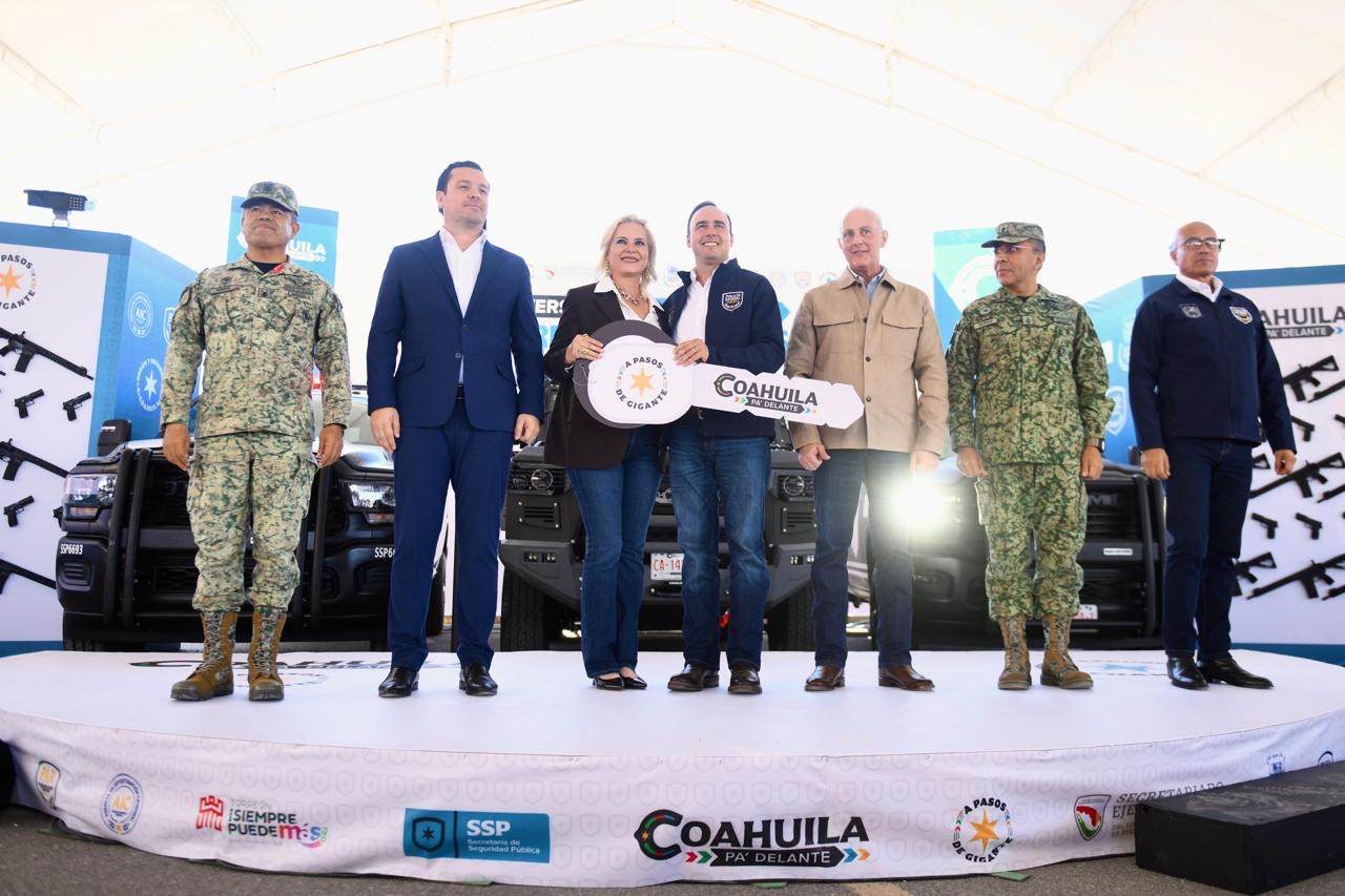 Señaló que con la entrega que realiza hoy el Gobernador, se refleja la voluntad en términos de presupuesto y de capacidad. “La coordinación con la sociedad civil, con empresarios, con los órdenes Gobierno, la Guardia Nacional, la Marina, el Ejército, la XI región, el 33 Batallón, y el Mando Especial, son parte fundamental para seguir trabajando y para seguir construyendo el Coahuila y el Torreón que todos queremos”.