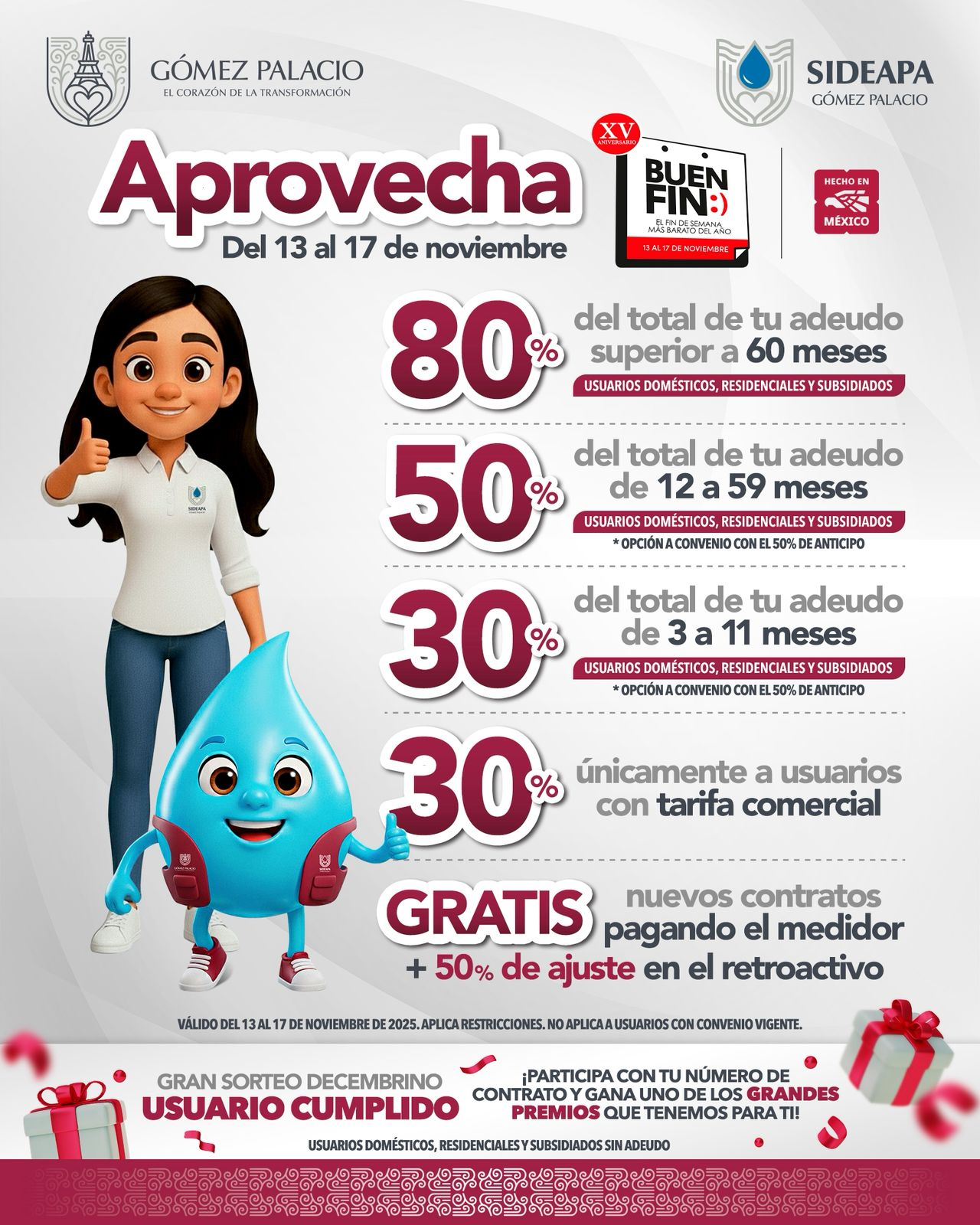 Gómez Palacio a 2 de noviembre del 2025.– Durante la conferencia matutina de este lunes, la presidenta municipal Betzabé Martínez Arango anunció el arranque del Festival de la Revolución, un esfuerzo conjunto entre el Gobierno Municipal de Gómez Palacio y el Gobierno del Estado de Durango, con el propósito de celebrar nuestras tradiciones, fortalecer la identidad y promover la cultura en toda La Laguna. La alcaldesa informó que el festival comenzará el miércoles 12 de noviembre con una caminata simbólica desde la Plaza de Armas hasta la Casa Faya, y a lo largo del mes ofrecerá una variada programación gratuita que incluye danza, música, muralismo, literatura, cine y exposiciones en distintos espacios públicos de la ciudad. “Queremos que noviembre sea un mes de fiesta, de orgullo e identidad. Gómez Palacio será nuevamente el corazón de la transformación cultural de La Laguna”, expresó Betzabé Martínez. Asimismo, la presidenta municipal anunció que el *Sistema Descentralizado de Agua Potable y Alcantarillado (SIDEAPA) aplicará descuentos especiales por el Buen Fin y el Festival de la Revolución, con el objetivo de apoyar la economía familiar y fomentar la regularización de los usuarios. Las promociones estarán disponibles del 8 al 22 de noviembre, con descuentos en recargos, convenios de pago accesibles y atención personalizada en el módulo central y en las oficinas regionales de SIDEAPA. “Sabemos que muchas familias hacen un esfuerzo por cumplir, por eso queremos ofrecer facilidades para que todos puedan ponerse al corriente. Este gobierno escucha, apoya y trabaja con sensibilidad”, destacó la alcaldesa. Martínez Arango reiteró que estas acciones forman parte de la estrategia para fortalecer los servicios públicos y garantizar un suministro de agua más eficiente y transparente, resultado de la reciente inversión histórica en maquinaria y equipamiento para SIDEAPA.