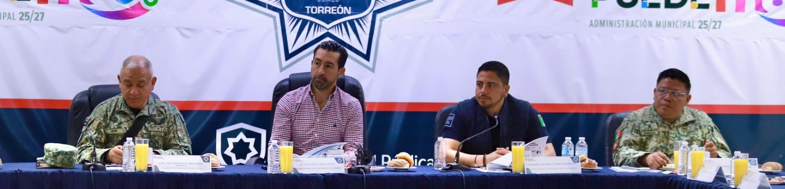 Torreón, Coahuila. A 04 de marzo de 2026 . Este miércoles, durante la novena reunión semanal de seguridad, el primer regidor del Ayuntamiento, Luis Jorge Cuerda Serna, en representación del alcalde Román Alberto Cepeda González, felicitó a todas las corporaciones de seguridad por su labor durante el operativo implementado con motivo del Maratón LALA 2026, destacando su compromiso para garantizar el orden y la tranquilidad de los participantes y asistentes. Cuerda Serna reconoció el trabajo coordinado que permitió el desarrollo exitoso de este evento masivo, el cual representa un importante impulso para la ciudad, al generar derrama económica, atraer turismo y proyectar a Torreón a nivel nacional e internacional. Asimismo, el regidor manifestó el mensaje del Presidente Municipal de no bajar la guardia y mantener el fortalecimiento de las estrategias de seguridad para los próximos eventos que se llevarán a cabo en la ciudad. Dijo que hay prevista una agenda con diversas actividades deportivas y artísticas que generarán mayor movilidad en la ciudad, además de las manifestaciones ciudadanas que deben cuidarse en materia de vialidad para evitar hechos de tránsito. Referente al índice semanal de incidencia delictiva, el comisario Alfredo Flores Originales, director de la Policía de Torreón, informó que del 23 de febrero al 01 de marzo, disminuyó con cero hechos, el robo en transporte colectivo, y el robo a transportistas. La Policía Municipal efectuó 98 detenciones que fueron remitidas al Ministerio Público y 184 al Juez Calificador. El Grupo de Reacción Torreón realizó 27 detenciones relacionadas con la posesión de narcóticos. Además, el comisario destacó que 80 oficiales de la DSPM acudieron a la capacitación impartida por la Secretaría de las Mujeres, así como la Secretaría de Seguridad Pública, el Centro de Empoderamiento de las Mujeres y la Comisión de Derechos Humanos del Estado de Coahuila, referentes al protocolo a implementar en la marcha del 8M, dirigidas a las corporaciones de seguridad de los tres órdenes de Gobierno. Por su parte, Martha Esther Rodríguez Romero, directora general del Centro de Justicia Municipal (CJM), informó que en el marco del Día Naranja, realizó un recorrido por las distintas áreas de trabajo de la dependencia, donde el personal participó firmando una pancarta con un mensaje de compromiso por entornos libres de violencia, como una acción de concientización.