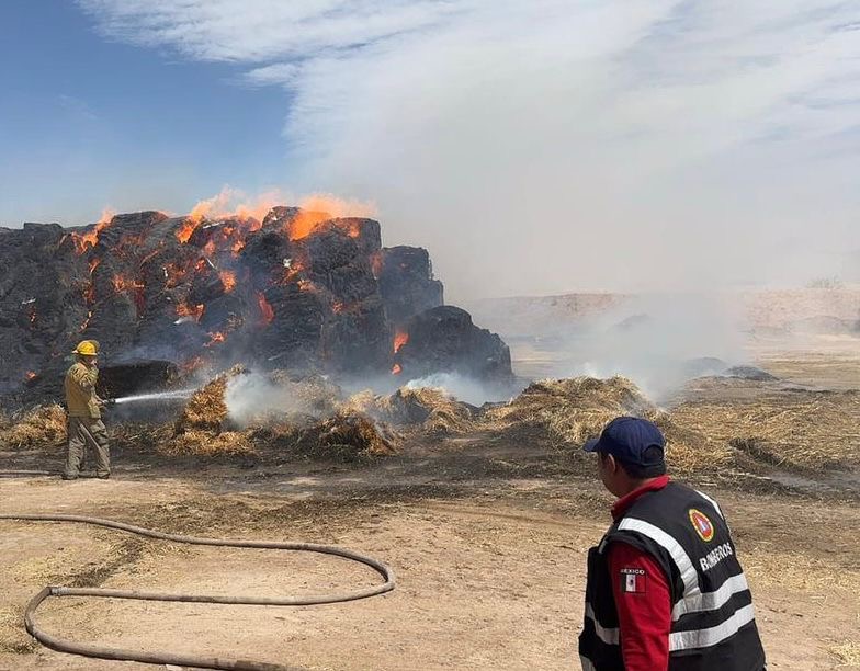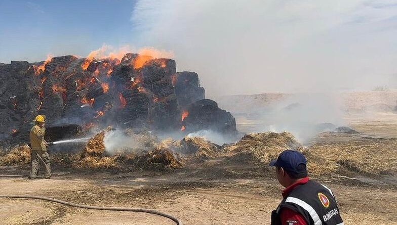 Lerdo, 11 de marzo 2026.- Elementos de Protección Civil y Bomberos atendieron un incendio de pacas de avena que se propagó a consecuencia de las fuertes ráfagas de viento registradas el pasado martes en el municipio de Lerdo.