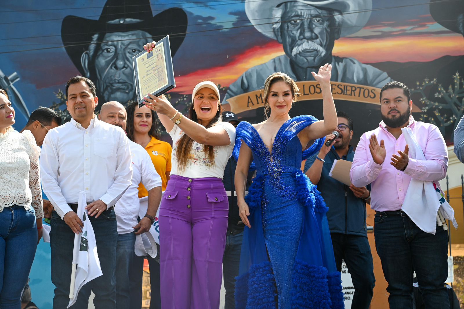 Fue alrededor de las 10:30 de la mañana cuando la presidenta municipal y los funcionarios recibieron a la Mariscal 2026, la artista Alicia Sifuentes, vocalista de la agrupación Mi Barrio Colombiano, quien recibió un reconocimiento de manos de la alcaldesa Susy Torrecillas por su trayectoria artística.