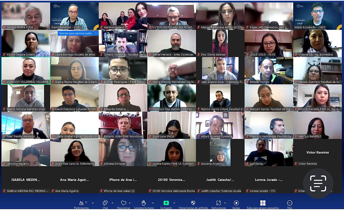 El director de Planeación, Jesús Alberto Montalvo Morales, informó que son 89 universitarios entre ellos, los tres coordinadores de Unidad, 18 directores de Unidades Académicas, 60 docentes y 8 personas de la Dirección de Planeación, quienes se capacitan, vía remota través de la plataforma Zoom para el llenado del instrumento de evaluación, por parte del personal de los Comités Interinstitucionales para la Evaluación de la Educación Superior (CIEES).