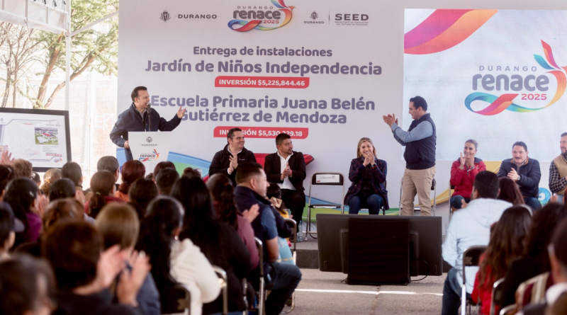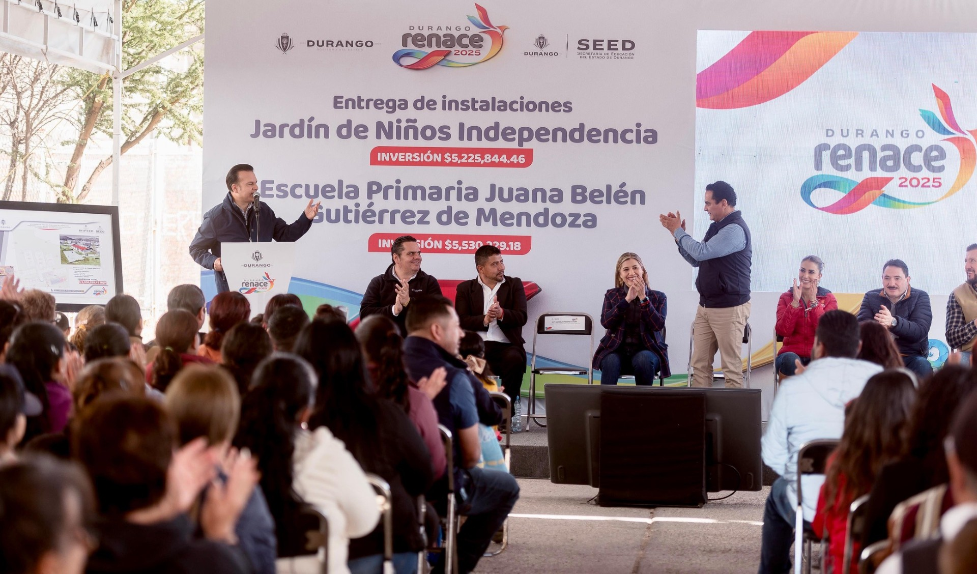 Con las nuevas escuelas en lugares cerca de los hogares, además de elevar el nivel de aprendizaje, en Durango renace la educación, manifestó el gobernador Esteban Villegas al entregar, junto al presidente municipal Toño Ochoa, las instalaciones del jardín de niños “Independencia” y la escuela primaria “Juana Belén Gutiérrez de Mendoza” en el fraccionamiento San Isidro.