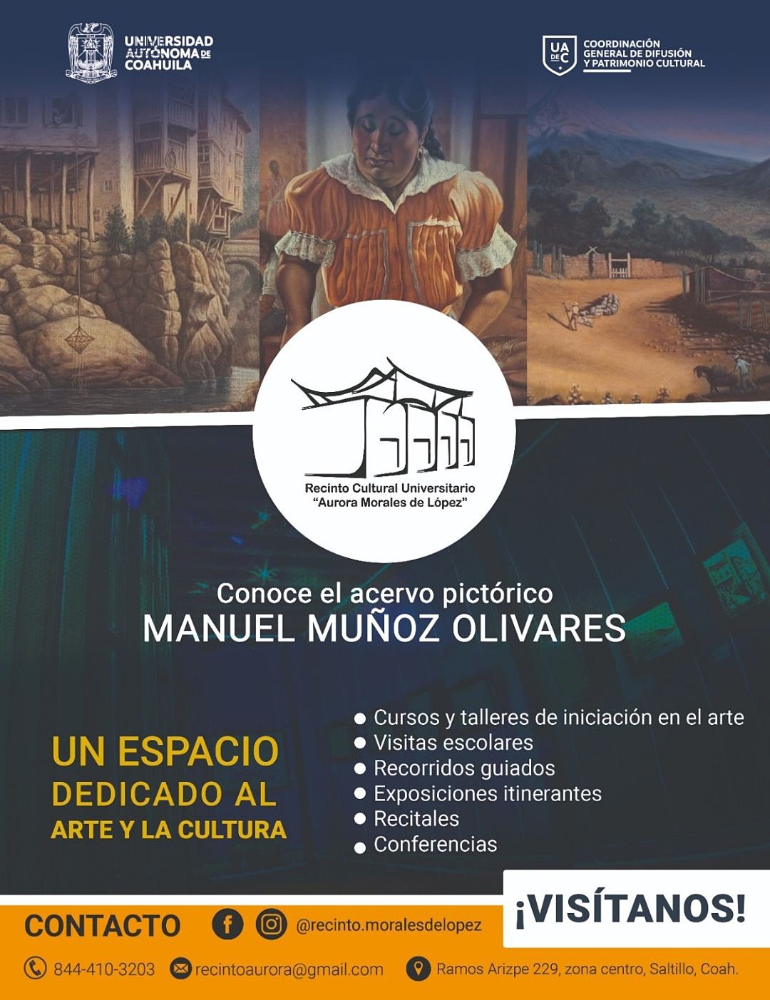 Para más información sobre las actividades que se realizan en el Recinto Cultural “Aurora Morales de López”, llamar al teléfono (844) 410 3203 o visitar la página de Facebook “Recinto Aurora Morales de Lopez” https://www.facebook.com/recinto.moralesdelopez.