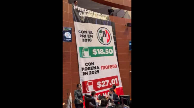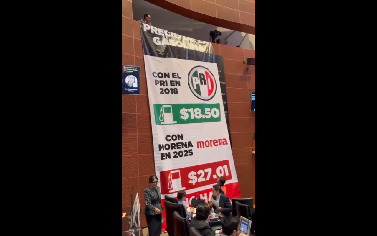 Este martes, durante la discusión en el Senado del paquete de reformas reglamentarias en materia energética, el PRI desplegó una gran manta en el Salón de Sesiones, donde se da conocer como el partido tricolor mantenía los precios de la gasolina en los 18.50 pesos, mientras que con Morena en algunos lugares llega a los 27.00 pesos.