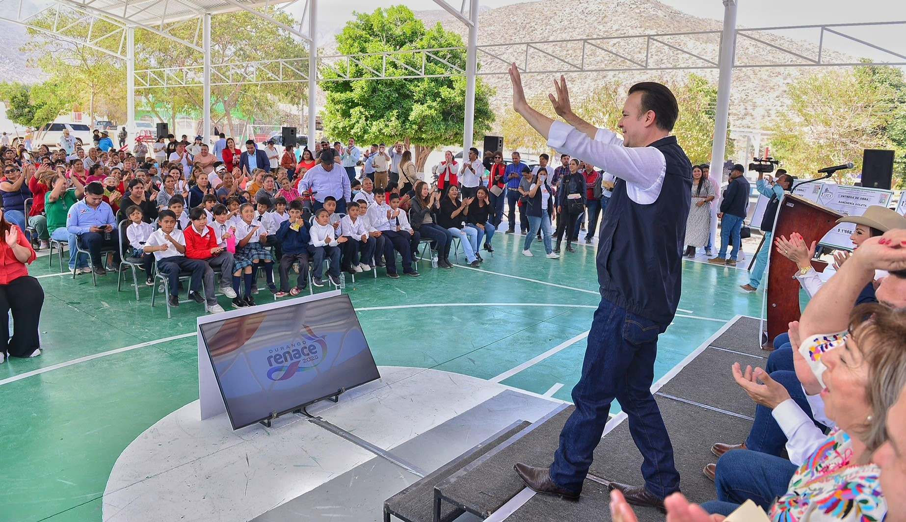 Lerdo, Durango.- “Estamos trabajando en proyectos que transforman la dinámica de las comunidades, mejoran la calidad de vida de las familias y responden a las necesidades de la gente”, afirmó el gobernador Esteban Villegas Villarreal al inaugurar, junto con el alcalde de Lerdo, Homero Martínez Cabrera, y la presidenta del DIF Municipal, Susy Torrecillas, un domo con cancha de usos múltiples en La Torreña, así como la pavimentación de calles en las rancherías La Goleta y La Borrega.