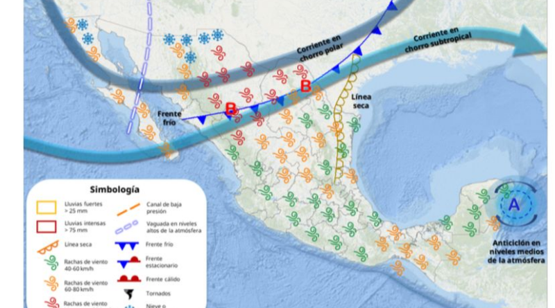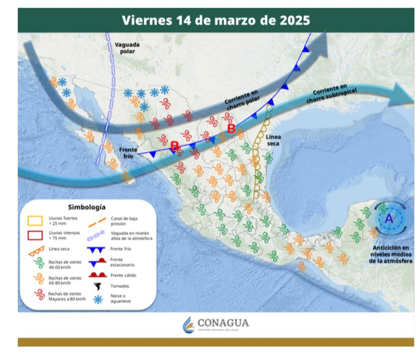 El viernes 14 de marzo, un nuevo frente frío se desplazará sobre Coahuila, interaccionará con una vaguada polar, con las corrientes en chorro polar y subtropical y con una línea seca que se establecerá sobre el noreste del país, generando vientos muy fuertes a intensos, de 40 a 50 km/h con rachas de 80 a 100 km/h con tolvaneras en el Estado.