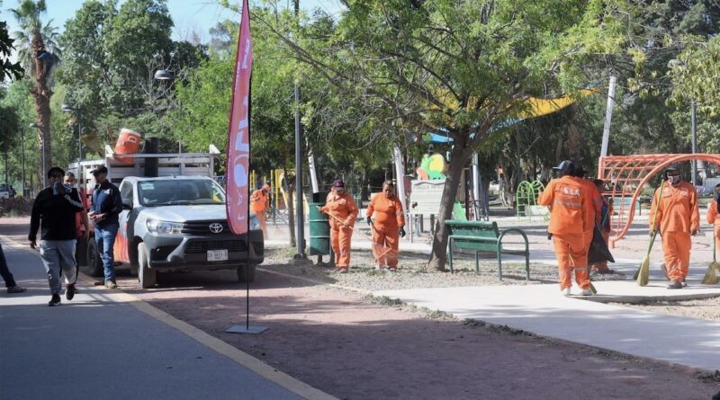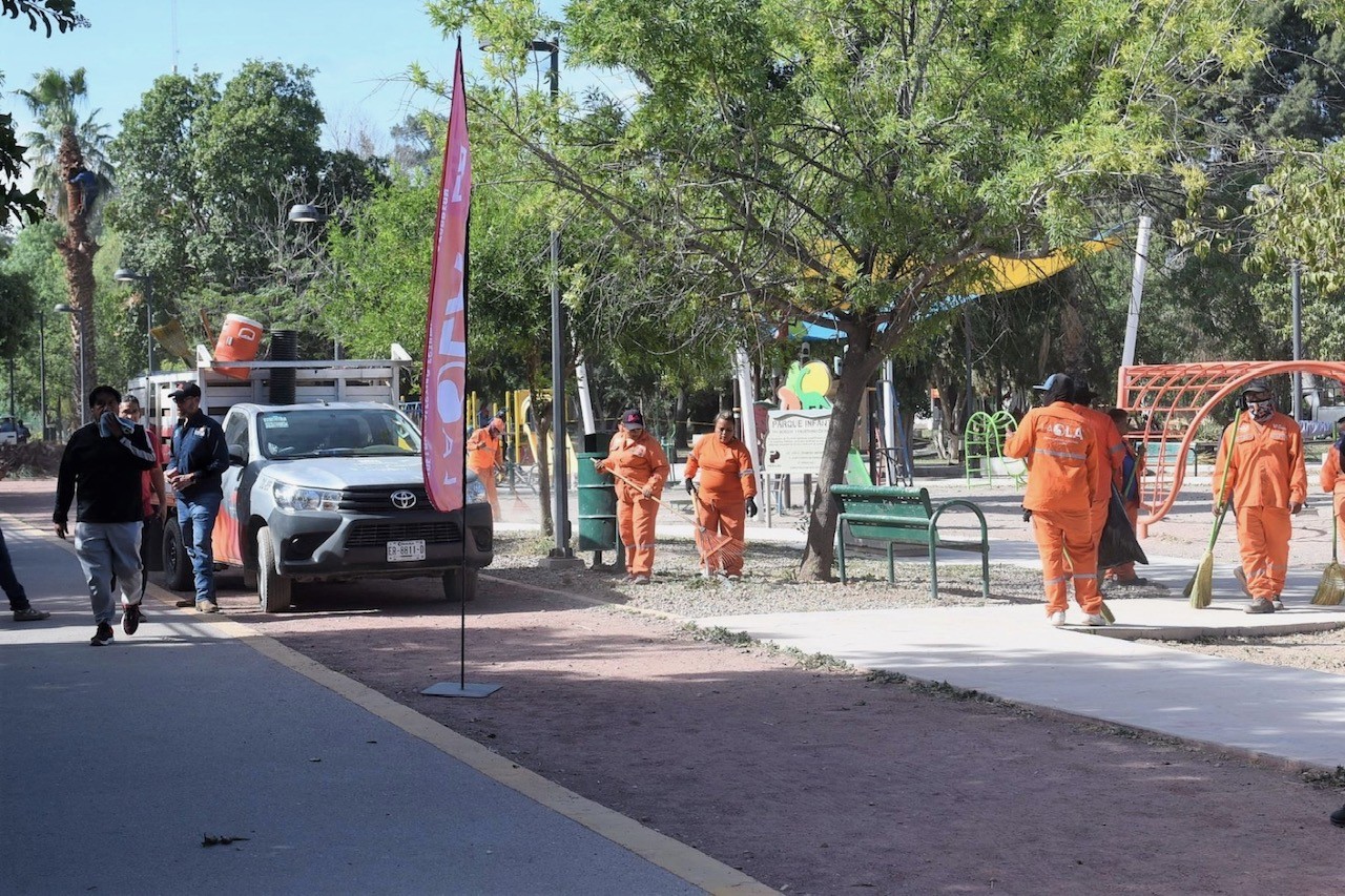 Este jueves cerca de 150 trabajadores de la Dirección de Servicios Públicos acudieron al Bosque Venustiano Carranza a realizar acciones de poda, pintura, barrido, mantenimiento del área de juegos, así como de las líneas del sistema de riego, tubería o aspersores, estos últimos se atienden de manera constante debido a que llegan a taparse o son dañados por los visitantes.